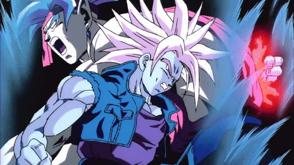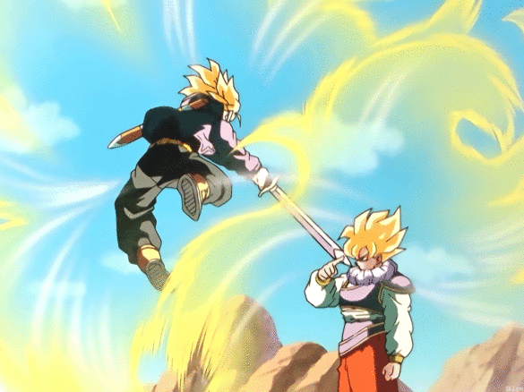 Trunks Super Saiyan tente de retenir Cell (2nde forme)