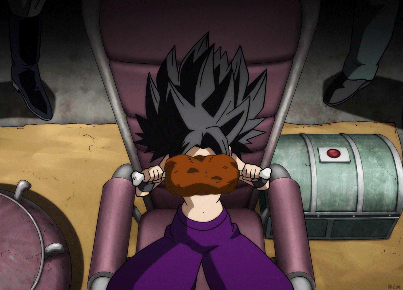 Première apparition de Caulifla dans l’épisode 88 de Dragon Ball Super. Elle mange de la viande avant sa rencontre avec Cabbe.