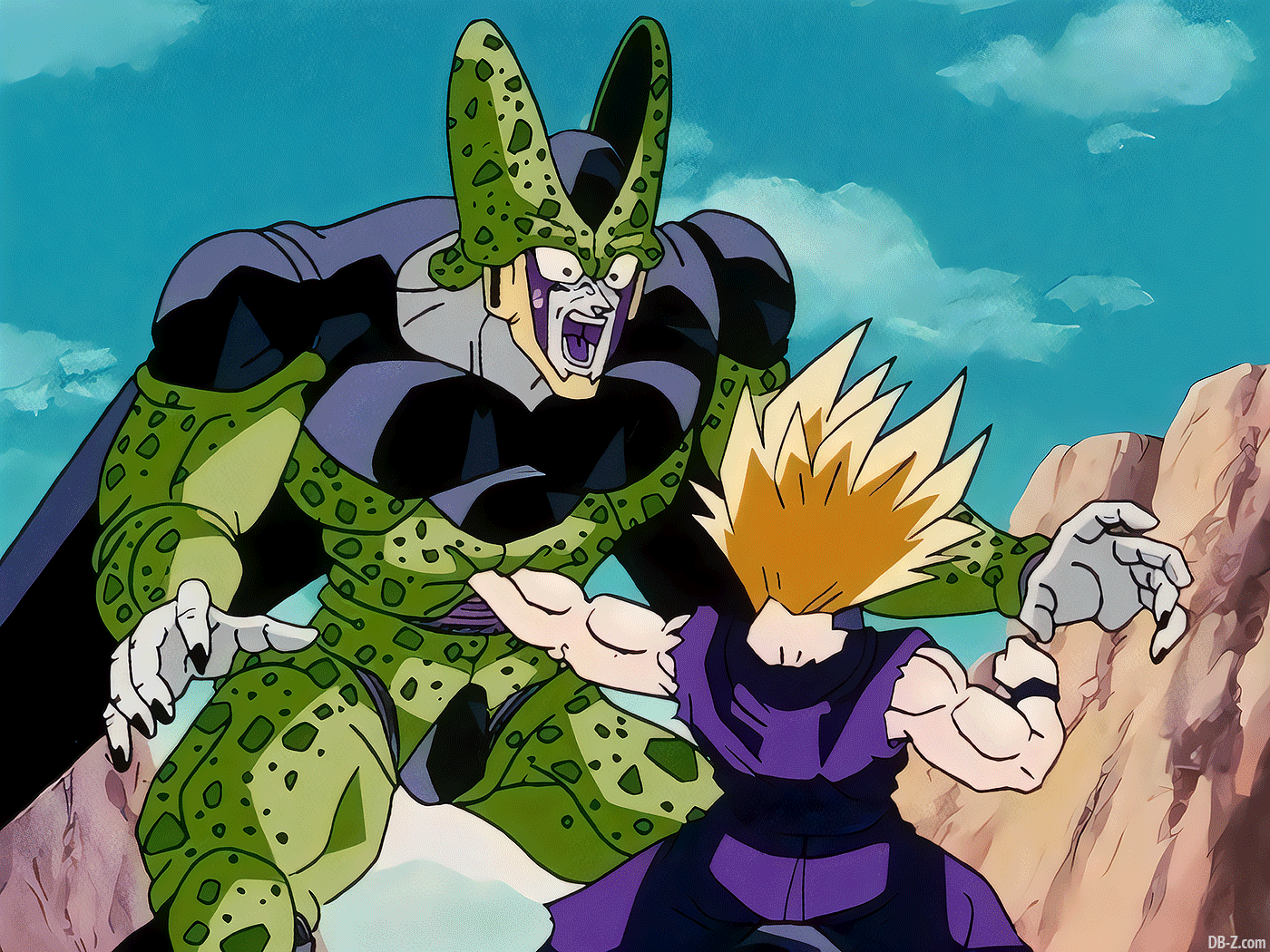 Réponse de Gohan à Cell, qui venait de lui mettre une patate en pleine tête. Gohan lui répond avec un coup au niveau des valseuses. Enfin pas tout à fait, plutôt dans le ventre. Cell n’a même pas encore eu le temps de ressentir la douleur.